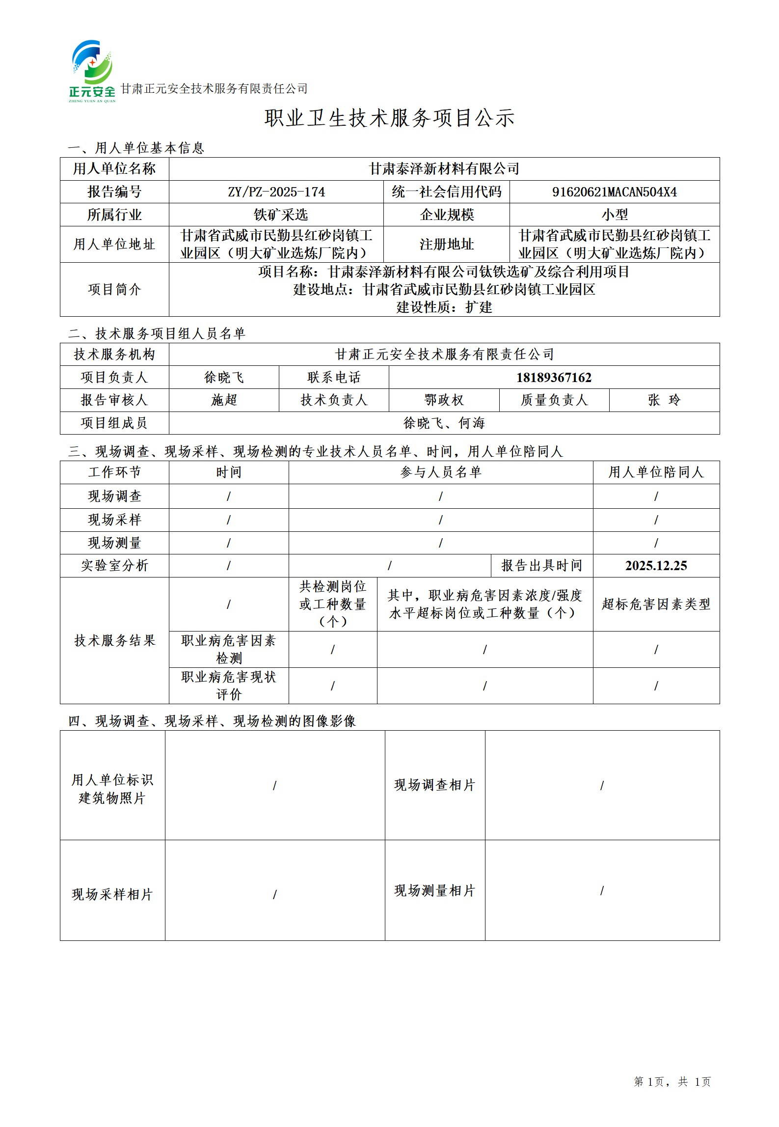 甘肃泰泽新材料有限公司钛铁选矿及综合利用项目职业病防护设施设计