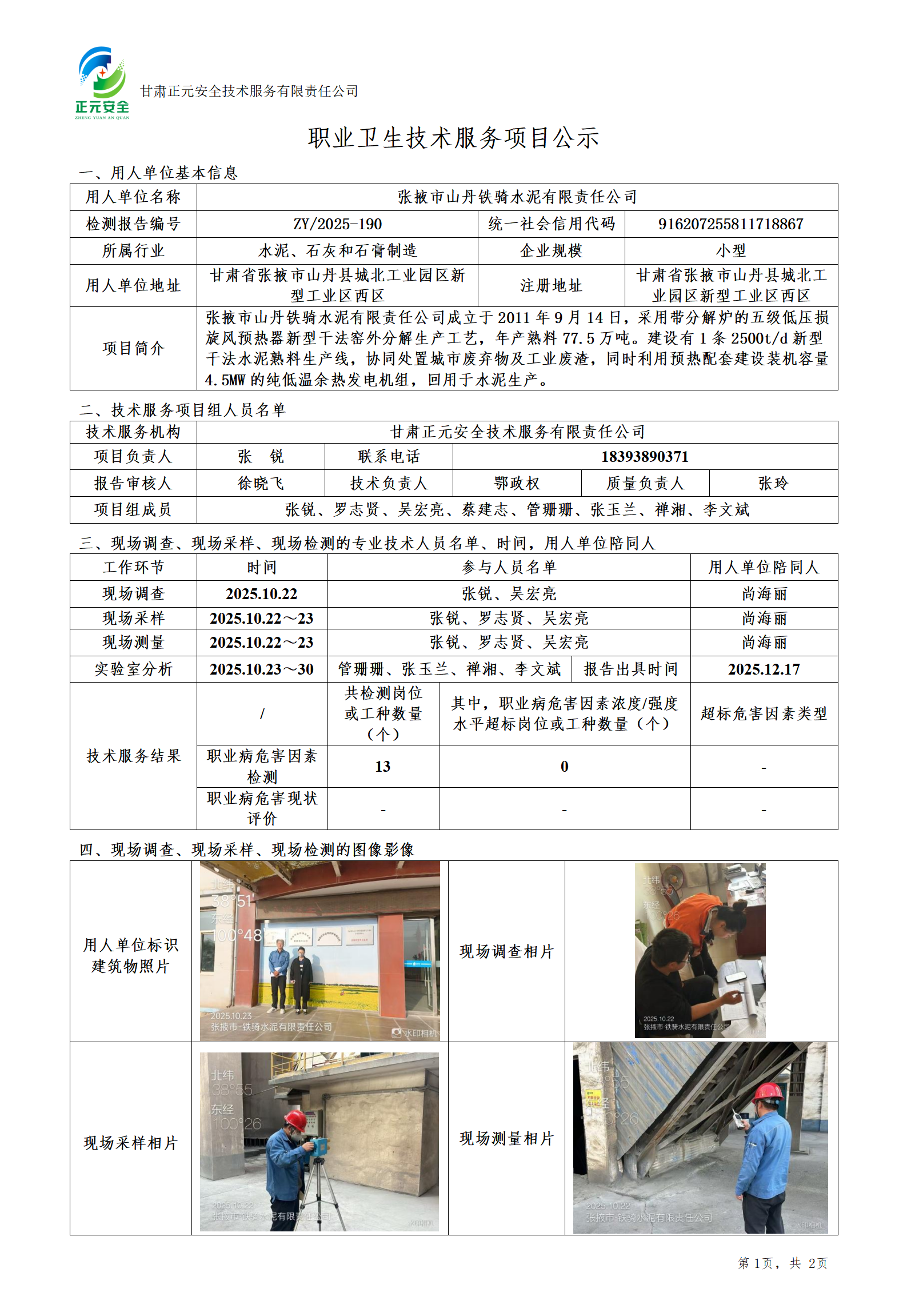 张掖市山丹铁骑水泥有限责任公司日产2500吨干法水泥熟料生产线职业病危害因素检测