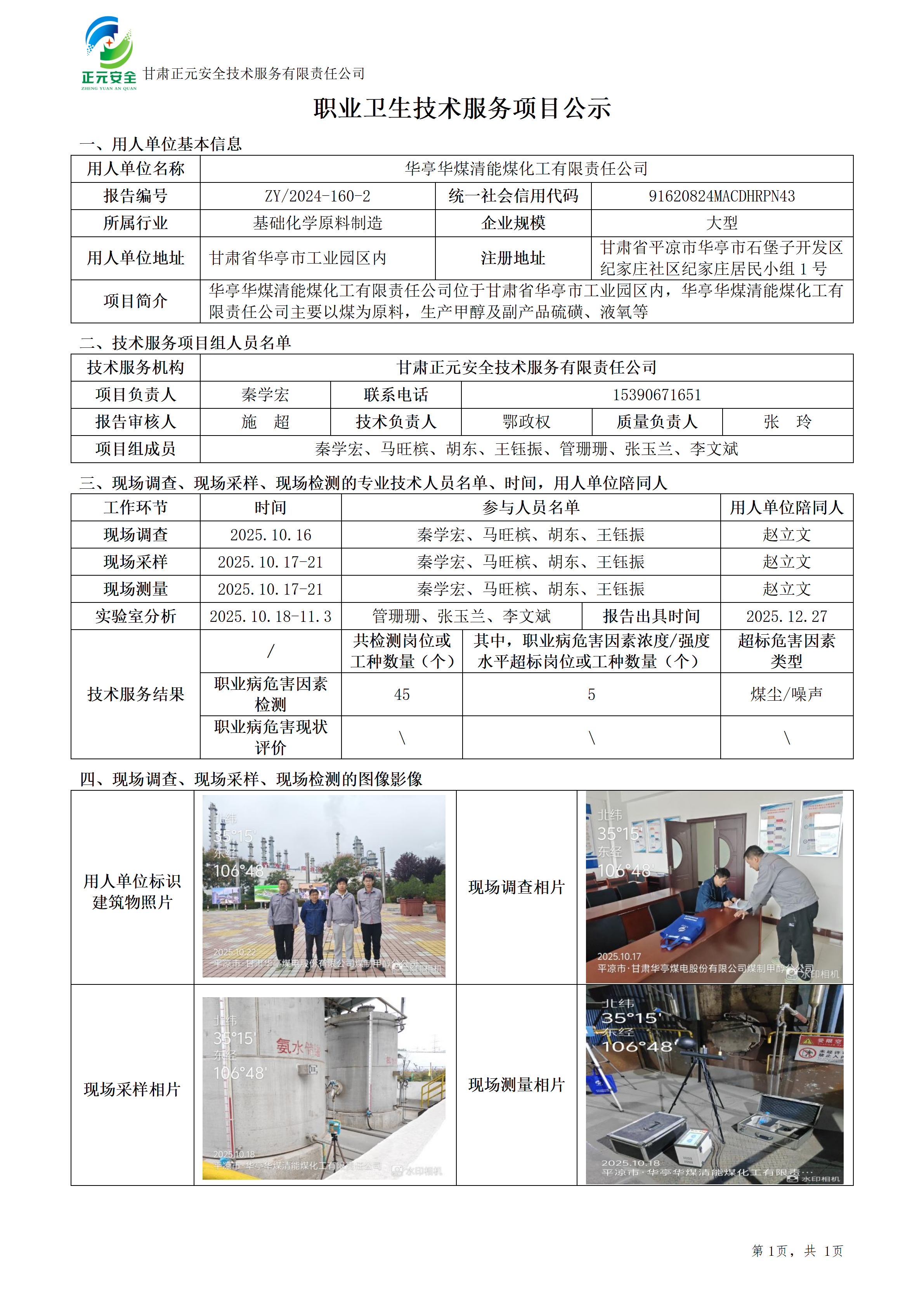 华亭华煤清能煤化工有限责任公司2025年职业病危害因素检测