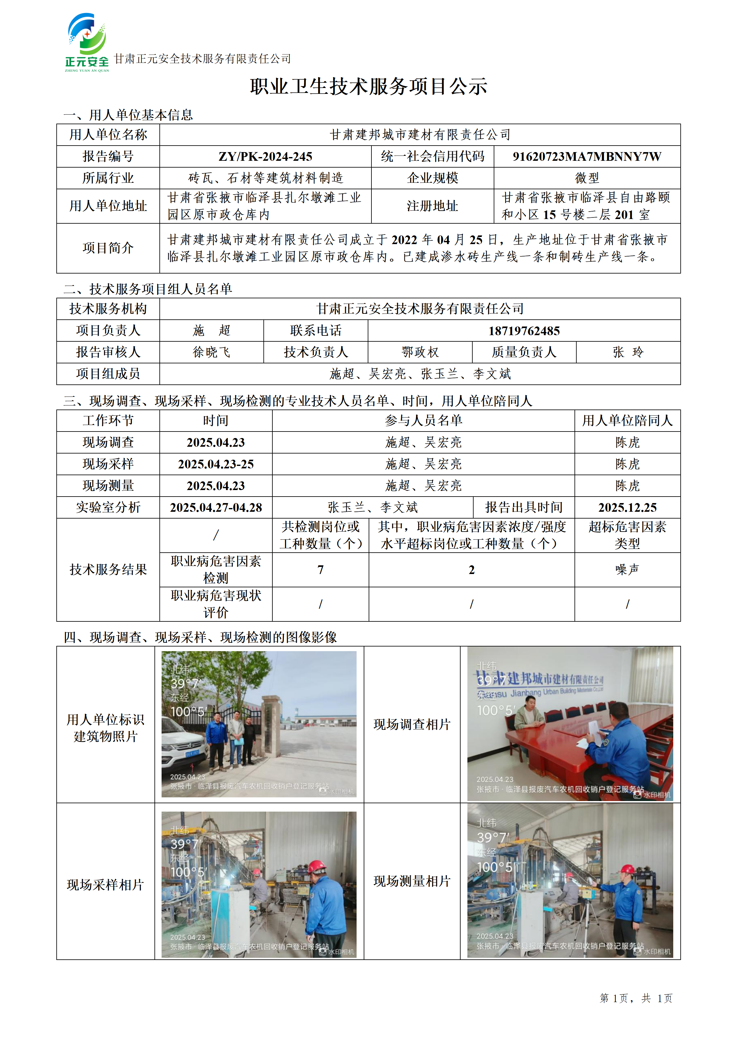 临泽县绿色新型建材生产线建设项目职业病危害控制效果评价