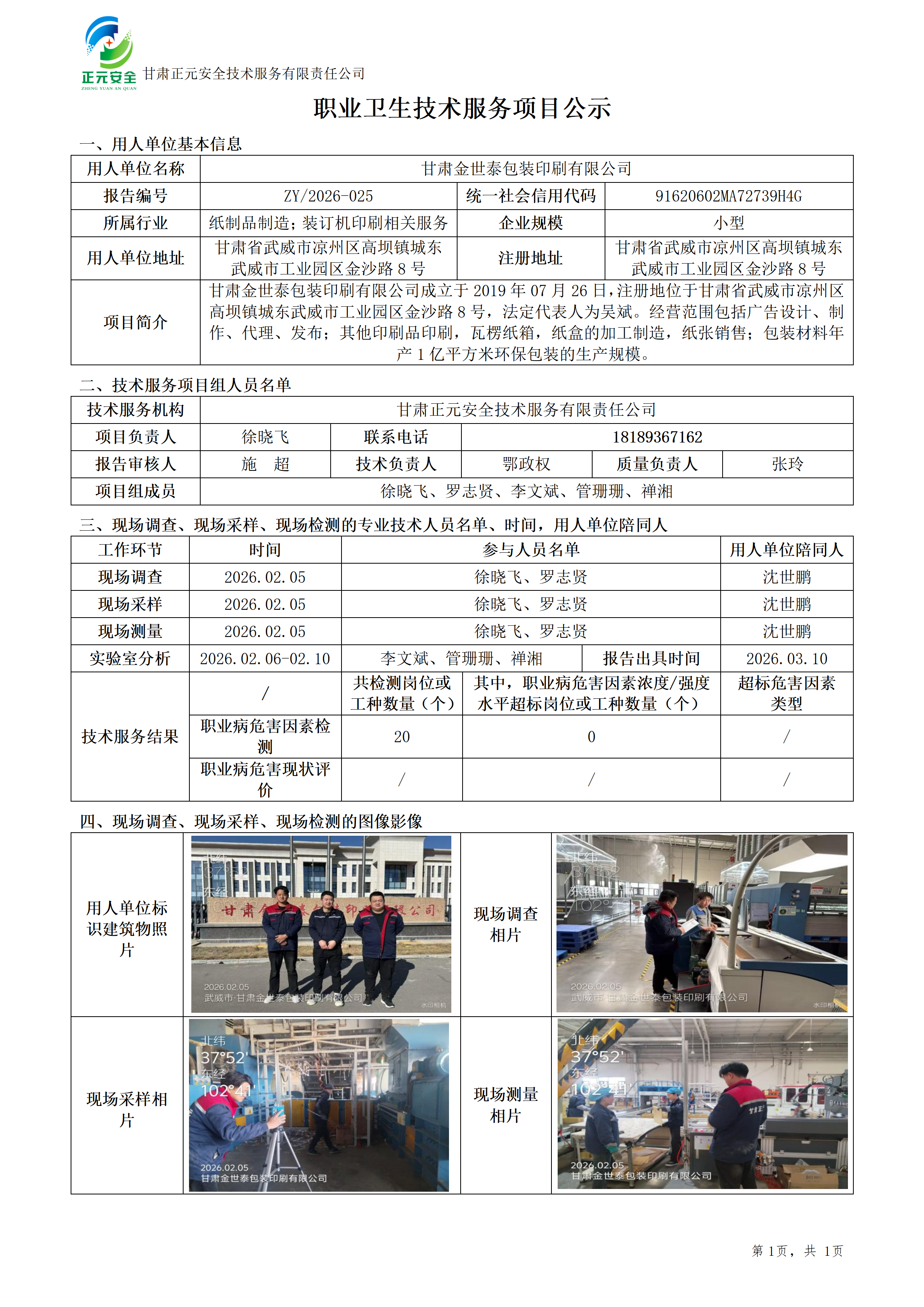 甘肃金世泰包装印刷有限公司职业病危害因素检测