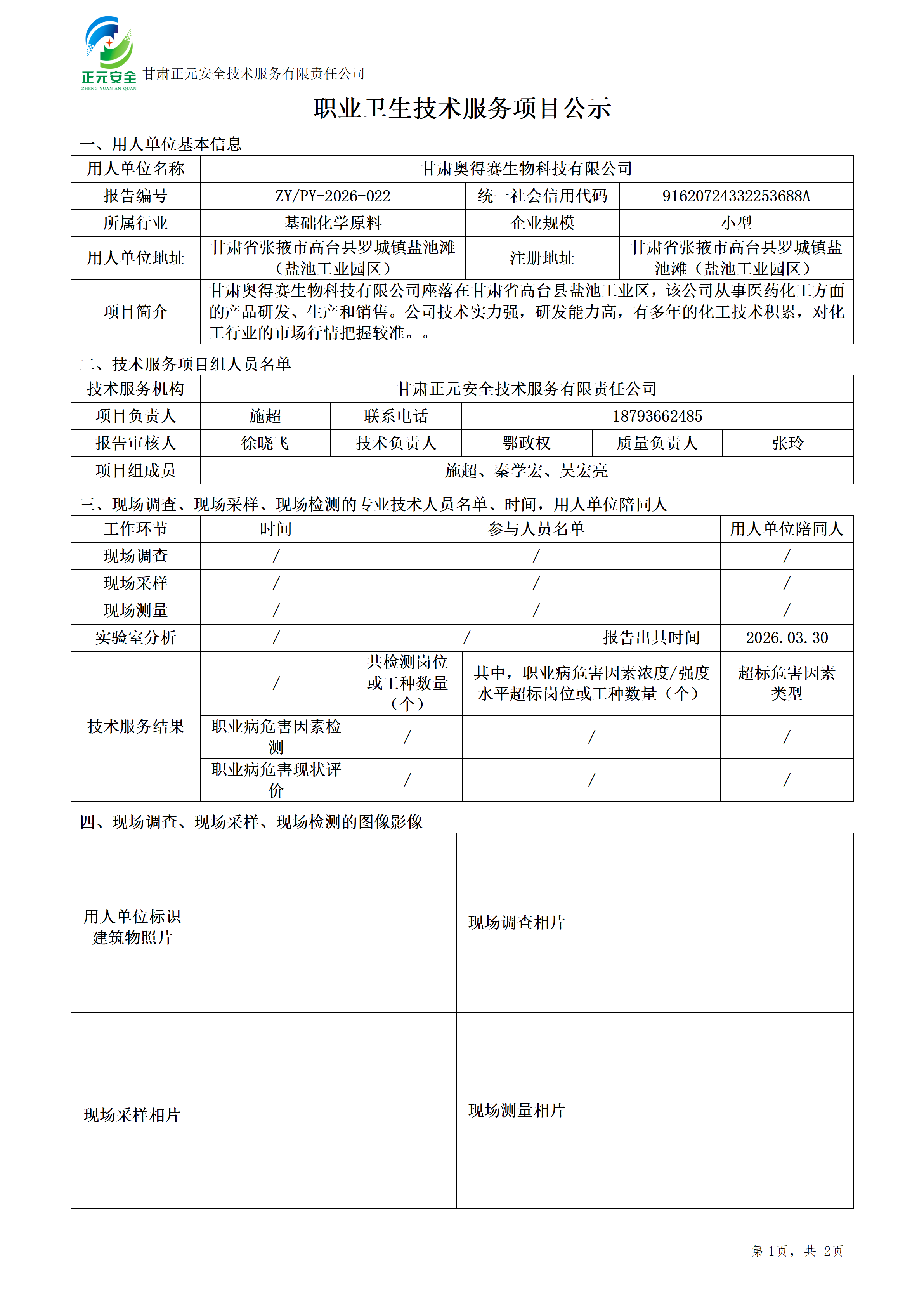 甘肃奥得赛生物科技有限公司年产10000吨1-硝基萘、8000吨橡胶防老剂(1-萘胺)建设项目职业病危害预评价