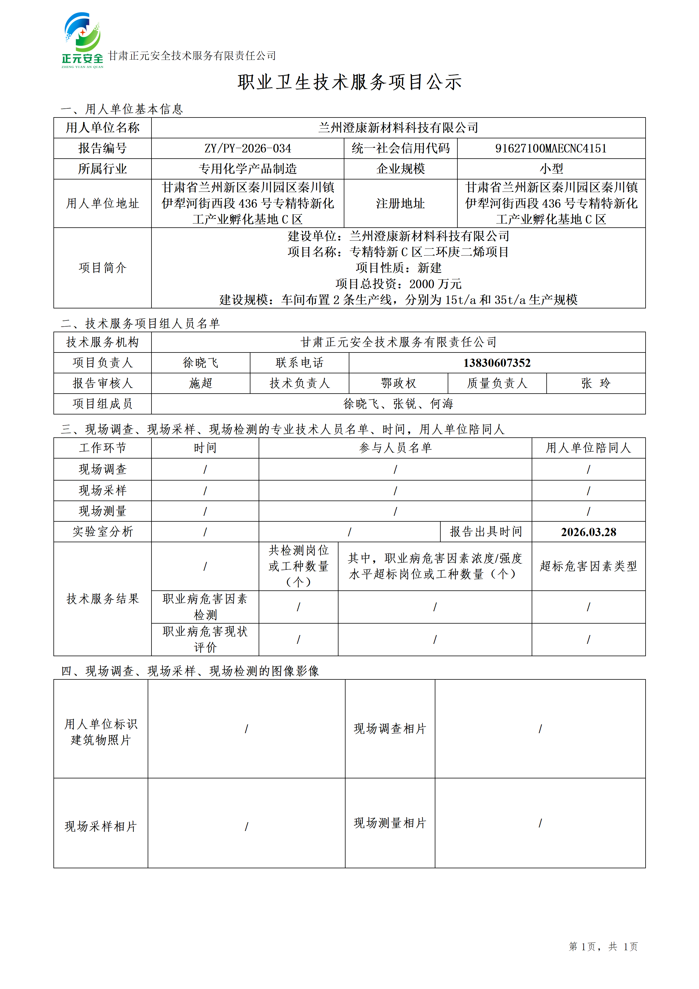 兰州澄康新材料科技有限公司专精特新C区年产50吨二环庚二烯项目职业病防危害预评价